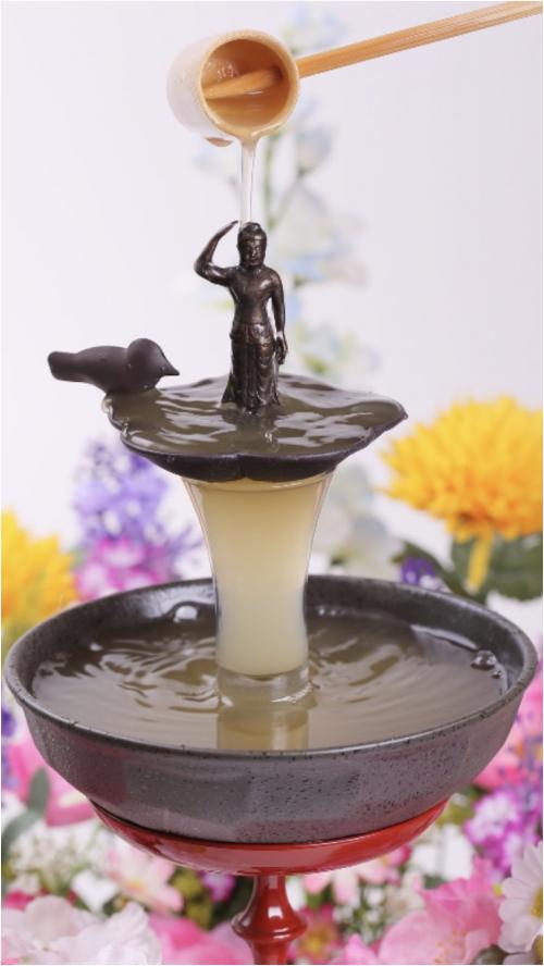 生誕のお祝い花祭りは『灌仏会』と言い九匹の龍が御釈迦様に生湯として甘茶を掛けたのが由来と言われています
